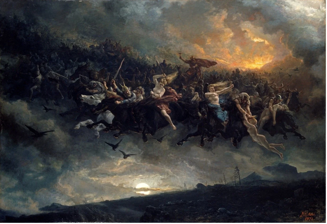 There was an increasingly ambivalent attitude to traditional folklore custom, a mingling of fear with fascination. An instance of this might be in attitudes towards the pre-Christian superstitions about the ‘Wild Hunt’, led by a disorderly spirit who could have been female or male. The spectral caper might result in wild revelry, or alternatively, in the destruction of anything in its path. The followers included fairies, elves, Valkyries, and the souls of the dead. It was believed that humans they met were likely to be absconded, swept away to the Underworld or the kingdom of fairies. Fairies, trolls, dwarves and kobolds … which could be helpful, mischievous or malign – they would in time morph into new figures, witches’ familiars. For with the growing authority of Christian belief, there could be only two kinds of spirits – angels and demons. Yet, still, somewhere beneath, in the collective memory, there lurked the tattered remnants of these older spirits.